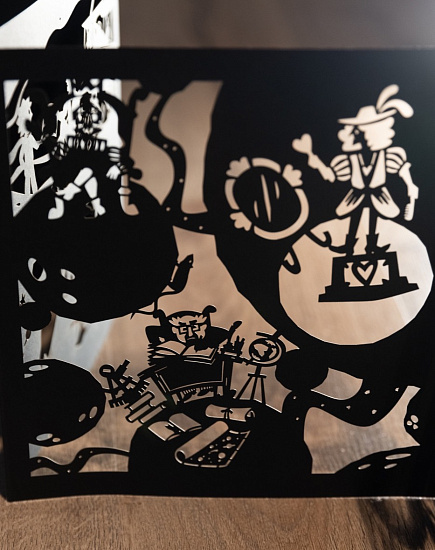 Театр теней – это детская книга-представление. В картонной основе вырезаны сцены с персонажами из детских сказок. В разложенном виде книга напоминает гармошку. Светите фонариком поочередно на каждый лист и рассказывайте истории. Персонажи будут оживать в виде теней на стене или потолке. Также можно листать театр теней как обычную книгу, разглядывая силуэты героев. Если не можете рассказать сюжет по памяти, зачитайте краткую версию сказки, что входит в комплект, или включите аудиозапись. Ее можно найти на сайте shadowplaybook.