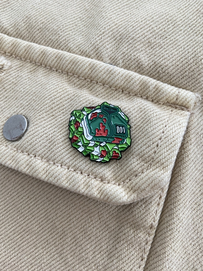 Украшение крепится к ткани иглой, на острый конец которой надевается резиновая шляпка. Таким образом пин крепко держится с двух сторон.