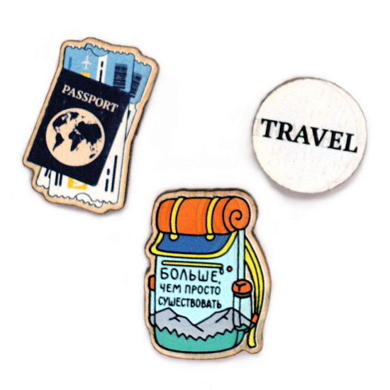 Набор из трёх значков на застёжке-гвоздике, напоминающим вам о том, что пора отправиться в путь: тут и билеты на самолёт, и собранный рюкзак и лаконичное travel. Набор значков - это любовь к путешествиям, значки будут сидеть, притаившись, на вашей кофте, дополняя образ и радуя глаз. Милые аксессуары от Магазина подарков Разверни, предлагаем вам выбрать значок на свой вкус и цвет. Для тех, кто вынужден одеваться по форме или дресс-коду или не решается носить значки, мы поможем выделиться и выразить себя. Этот модный и стильный аксессуар сгодится для людей разного возраста.