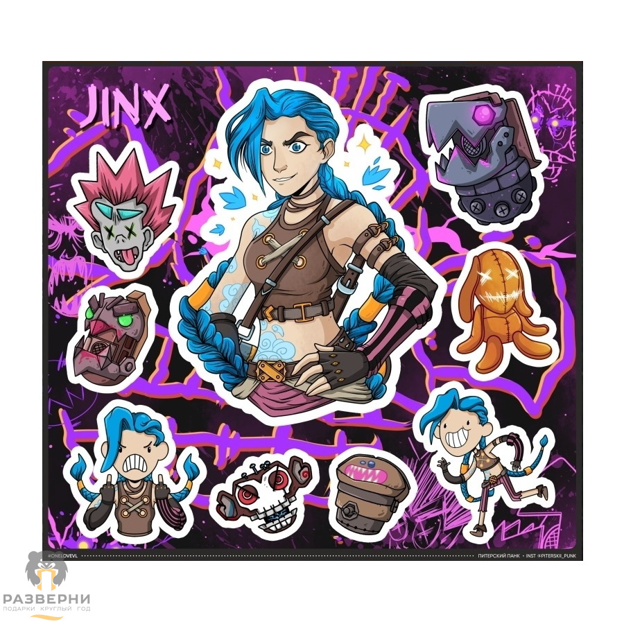 Обклейте всё вокруг стикерами из набора, посвящённому Джинкс! Эта бледная стройная девушка с голубыми косами покорила сердца многих игроков «League of legends» и зрителей сериала «Arcane». Наклейки с ней добавят немного веселья и безумства вашим вещам. Фан-арт нарисовал Питерский панк.