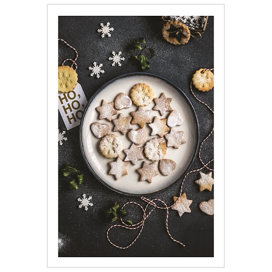 Скоро долгожданные новогодние праздники, когда самые теплые пожелания сливаются с самыми приятными подарками. Конечно, какой Новый год без праздничной открытки. Такую открытку вы можете отослать своим родным или подарить домашним. Бумага из которой сделана открытка напомнит всем о праздничном настроении и сделает его еще более приятным. Изображение рождественских печенек от Санты не даст замерзнуть в холодную пору. Дарите в этот волшебный праздник подарки в дополнение с милой открыткой.