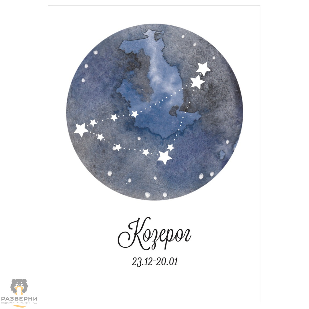 Открытка украшена акварельным рисунком наиболее ярких звёзд созвездия Козерога. На обороте вы прочитаете краткое описание знака.