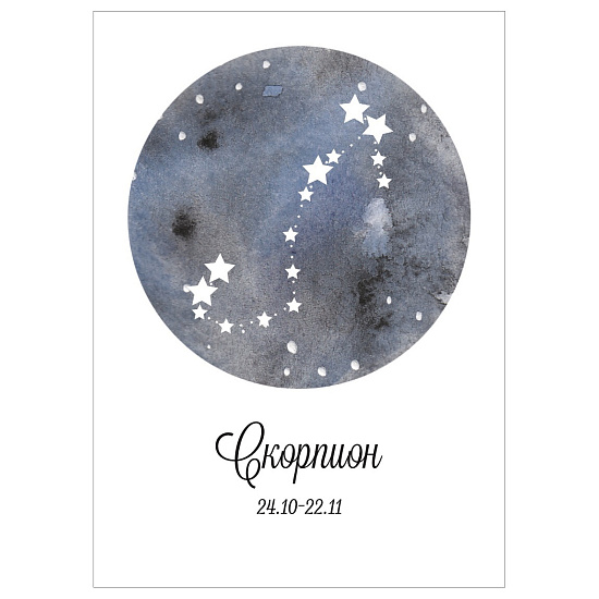 Открытка украшена акварельным рисунком наиболее ярких звёзд созвездия Скорпиона. На оборотной стороне даётся краткое описание этого зодиакального знака.