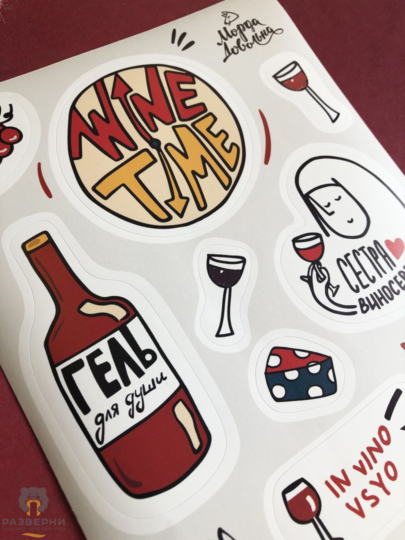 Стикерпак — классное дополнение к развитию человечества, ибо содержит в себе не одну, не две и даже не три, а целый набор наклеек! Самое главное, что чаще всего наклейки в стикерпаке объединены какой-либо животрепещущей и очень близкой нам теме, как, например, и получилось с этим набором стикеров — его объединила тема великого и благостного винишка. Стикерпак это не только о том, чтобы клеить куда угодно, но и о том, чтобы клеить много! Стикерпак «In vino vsyo» - это удивительное дополнение к подарку, нет причин не купить стикерпак другу или родственнику. Чтобы заклеить всё. Вином.