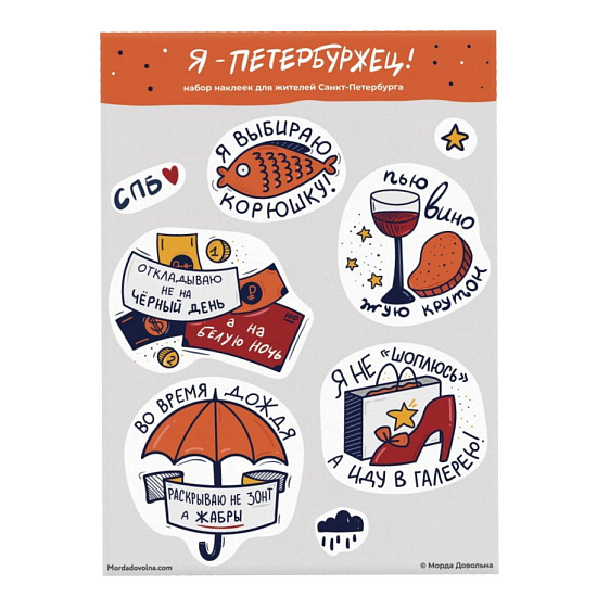 Стикерпак — чудесное изобретение человечества, ибо содержит в себе не одну, не две и даже не три, а целый набор наклеек! Самое главное, что чаще всего наклейки в стикерпаке объединены какой-либо животрепещущей и очень близкой нам теме, как, например, и получилось с этим набором стикеров — его объединила тема уютного и любимого нами города Санкт-Петербург.