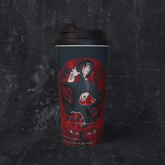 Принт с Учиха Итачи нарисован для поклонников манги и аниме «Наруто». «Sono sharingan... omae wa doko made miteru?» цитируется под рисунком.