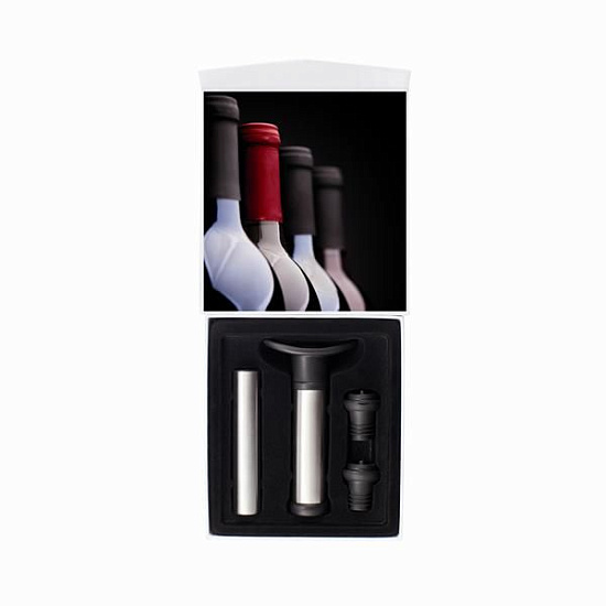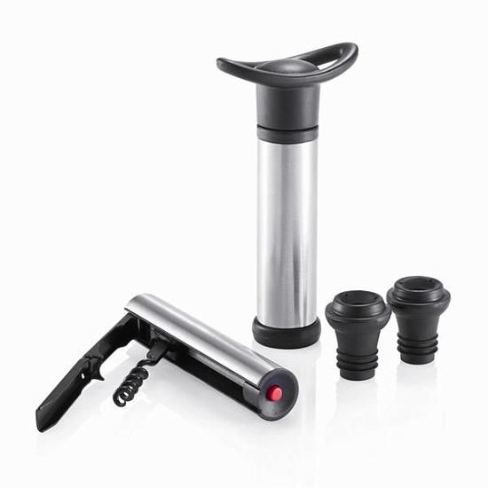 В комплектацию набора входят: штопор, 2 стоппера для бутылки, обладающих герметизирующими свойствами, а также специальное устройство, которое служит для более удобного извлечения стопперов. Благодаря этому, уже открытая бутылка с вином или другим алкогольным напитком не испортится.